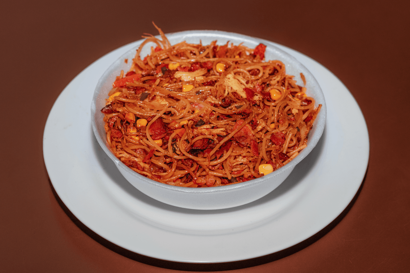 Macarrão, bacon, calabresa, frango, queijo, milho, pimentão, tomate, cebola e molho shoyu.
